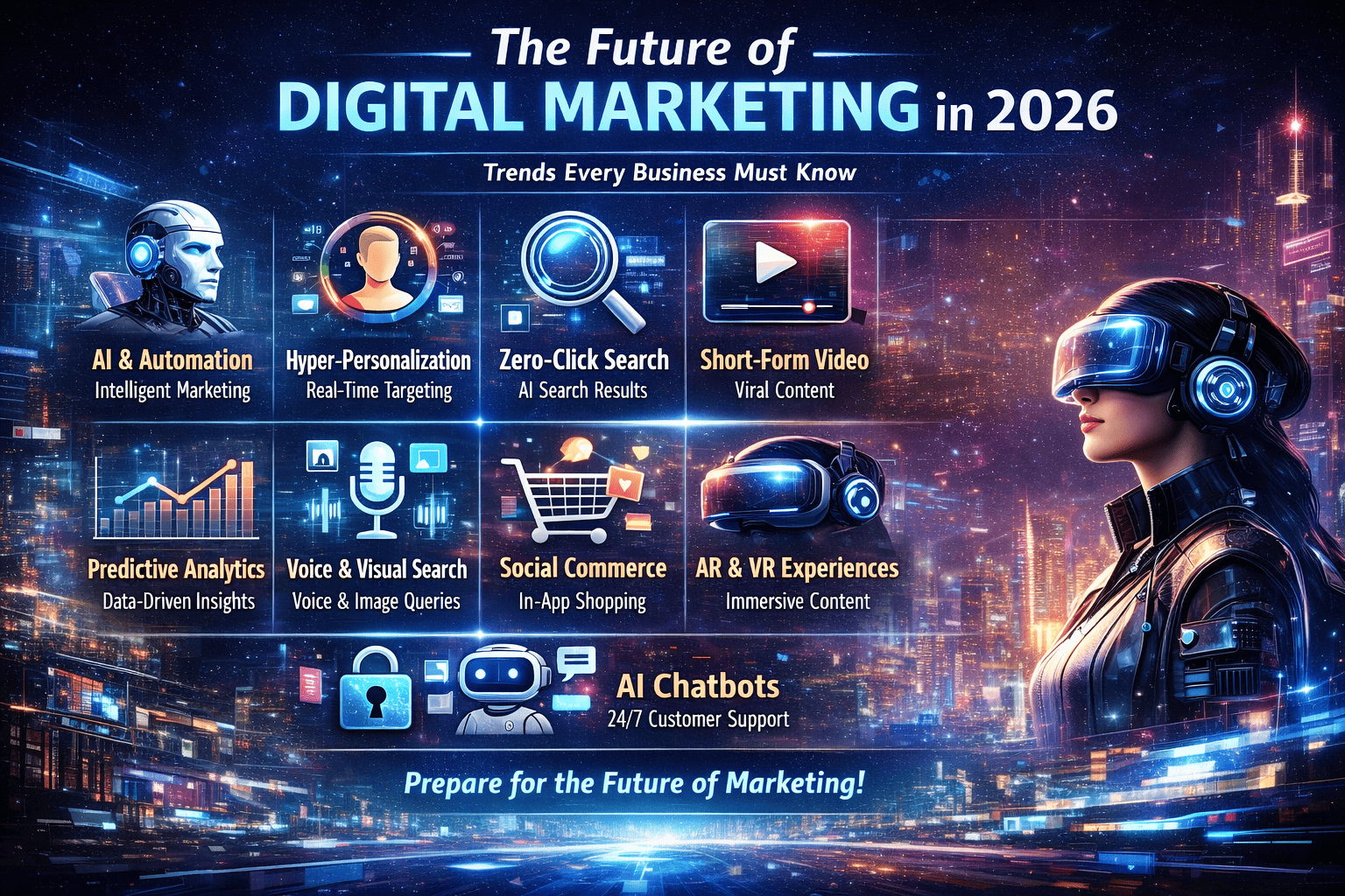 The future of digital marketing in 2026 will be driven by technology, personalization, privacy, and customer-centric strategies. AI, automation, voice search, video marketing, influencer marketing, and immersive technologies will shape the digital marketing landscape. Businesses must adapt to these trends to stay competitive and meet evolving customer expectations.